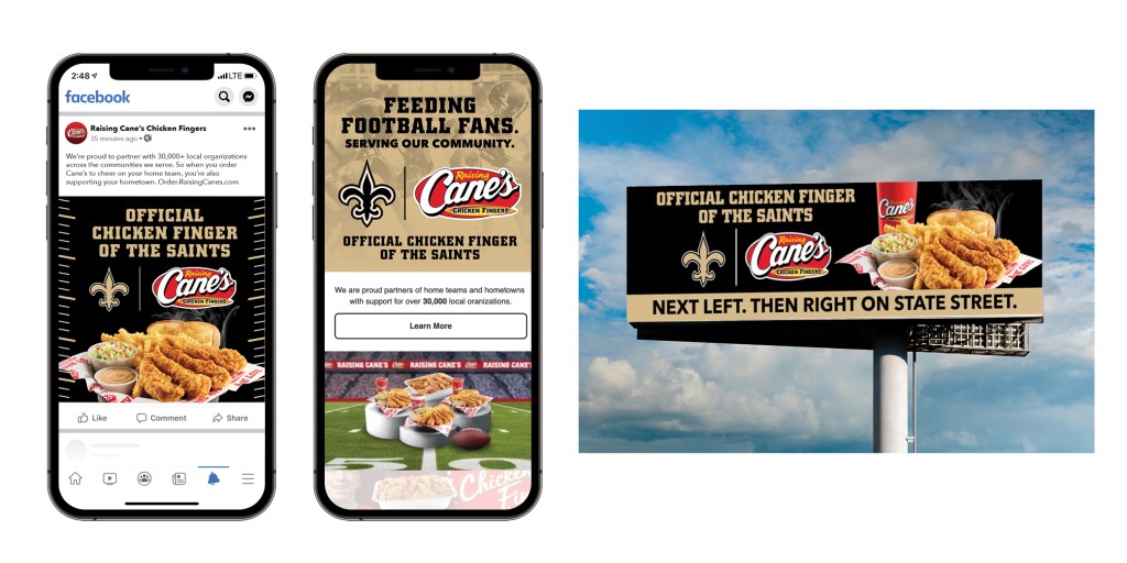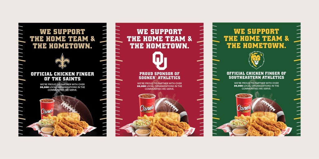 Annual collegiate and professional football team sponsorships with Raising Cane’s including over 50 teams with full POP kits and digital media. Role: Concepting and Graphic Design